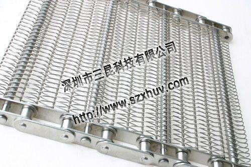 10.鏈條式網(wǎng)帶:由鏈條驅(qū)動的輸送網(wǎng)帶一般都由鏈條帶動小軸再帶動網(wǎng)帶運行。 網(wǎng)帶都采用軋牙串條、左右網(wǎng)條二根串,并大小網(wǎng)條連接而成,大網(wǎng)條內(nèi)穿進小軸,小軸二端穿入鏈條孔,從而達到鏈條驅(qū)動輸送網(wǎng)帶。鏈條網(wǎng)傳動平穩(wěn)、傳動力矩小。11,U型鏈條網(wǎng)帶,也可作為螺旋式網(wǎng)帶,采用進口電腦網(wǎng)帶機生產(chǎn),網(wǎng)面強硬耐用,不易變形。最大特點是轉(zhuǎn)彎性能好,可以實現(xiàn)180度的轉(zhuǎn)彎,且運行平穩(wěn)。具有網(wǎng)面平整,可承載較重的壓力和拉力。通風透氣性能好,網(wǎng)面潔凈無毒,而且容易清洗。維修和拆卸極為方便。可根據(jù)客戶要求在網(wǎng)帶兩側(cè)加裝擋邊。